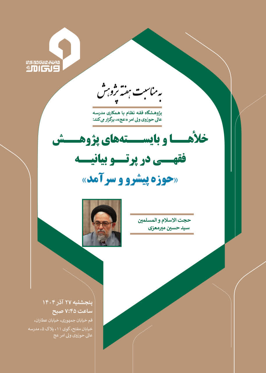 🔰به مناسبت هفته پژوهش، پژوهشگاه فقه نظام با همکاری مدرسه عالی حوزوی ولی امر عج برگزار میکند: